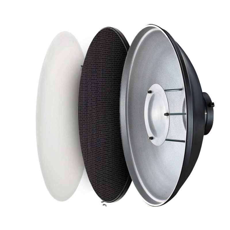 Портретная тарелка с сотами Mircopro RF-550 или как еще еe называют Beauty dish (бъюти диш) дает мягкий и равномерный по полю, но направленный свет. Свет от портретной тарелки очень хорошо прорабатывает структуру кожи и создает характерный светотеневой рисунок.