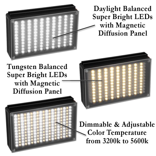 На панели LED-209AS размещены два типа светодиодов с цветовой температурой 5600K и 3200К. Дополнительный диммер позволяет плавно изменять цветовую температуру в диапазоне 5600K - 3200К.