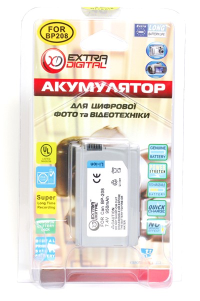 Аккумулятор EXTRA DIGITAL BP-208 для Canon (аналог Canon BP-208, BP-208DG) - литиево-ионная батарея предназначена для фотокамер и видеокамер. Данный аккумулятор обеспечивает надежную, стабильную и бесперебойную работу фото и видео аппаратуры. Основными преимуществами аккумулятора EXTRA DIGITAL BP-208 есть высокая энергетическая плотность, длительный уровень заряда, низкий уровень саморазряда, даже при длительной эксплуатации, отсутствие «эффекта памяти заряда аккумулятора» и способность быстрого заряда батареи.