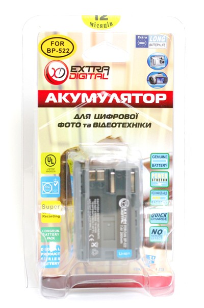 Аккумуляторная батарея EXTRA DIGITAL BP-522 - это достойная замена оригинальных аккумуляторов Canon BP-508, BP-511, BP-511A, BP-512, BP-514, BP-522.
