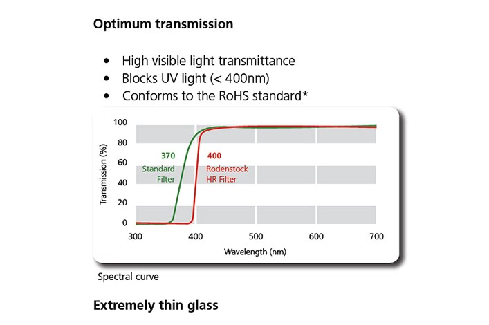 Ультрафиолетовый защитный фильтр Rodenstock HR Digital Super MC UV Filter UV 58мм изготавливается из высококачественного оптического стекла производства компании Carl Zeiss, которое есть абсолютно нейтральным и пропускает видимый спектр света без помех, что полностью исключает появление какого либо цветового оттенка на изображении. А специально применяемая технология двухстороннего мультипросветления Multi Coating вместе со специальной технологией чернения оправы и покрытием краев фильтра матово-черной углеродистой краской предотвращает засветку, нежелательные блики, внутреннее отражение и виньетку по краях кадра. Покрытие HR делает фильтр устойчивым к появлению царапин а также обладает водоотталкивающими свойствами.
