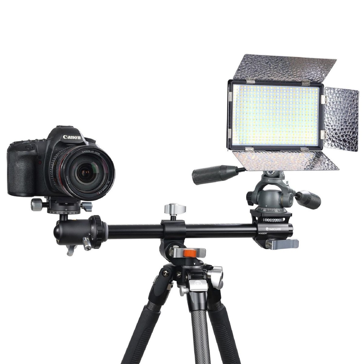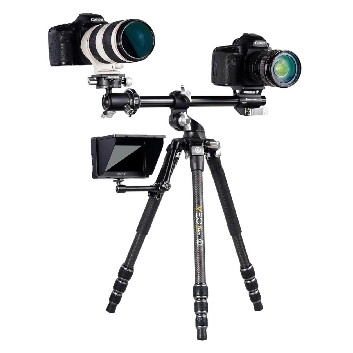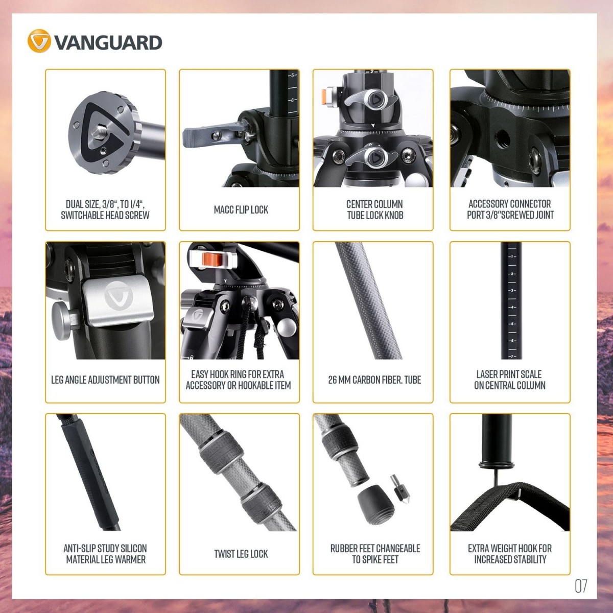 Multi-Angle Central Column (MACC). Компания Vanguard стала первой, кто оснастил штативы мультипозиционной центральной колонной (MACC). Мультипозиционная колонна одновременно обеспечивает вариативность и стабильность. В отличие от стандартных решений, где центральная колона поднимается/опускается по высоте, либо переводится в горизонтальный режим и вращается в одной плоскости, мультипозиционная центральная колонна MACC вращается в трех плоскостях на 360° и может быть зафиксирована практически в любом положении, что открывает новые возможности для макросъемки и одновременно обеспечивает моментальную трансформацию в позицию для панорамной съемки. Изменение положения колонны из вертикального в горизонтальное не требует разборки штатива, и даже может проводиться с присоединенной камерой. Также мультипозиционная колонна MACC, переведенная в горизонтальную позицию, предназначена для монтажа дополнительного оборудования, такого как вторая камера, смартфон, микрофон, монитор, осветительное оборудование, подзорная труба и др. С этой целью штатив укомплектован адаптером VEO + MA1.